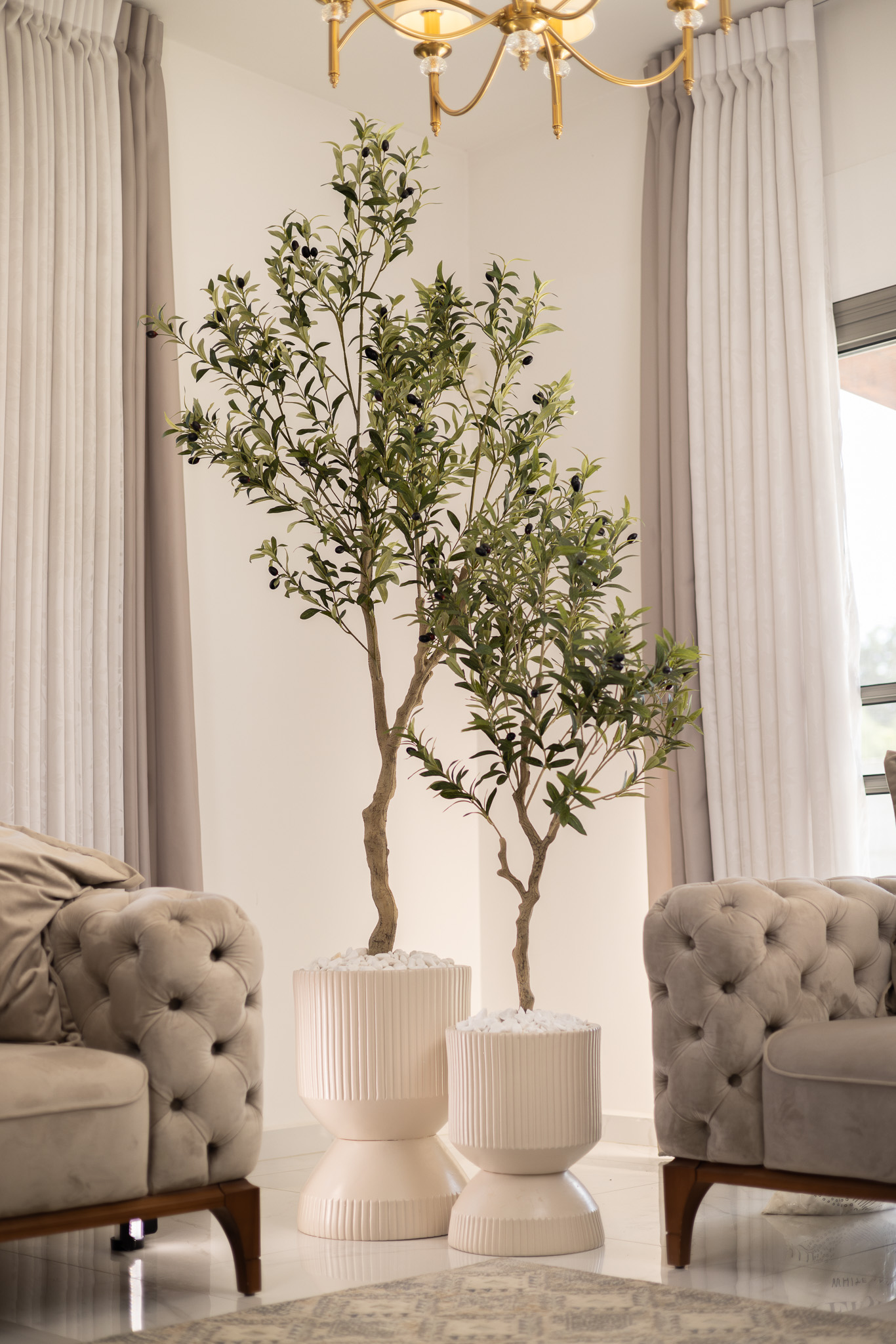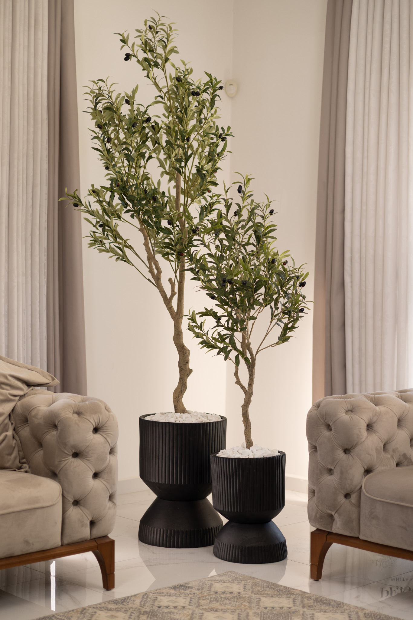 עציצים מעוצבים עם עצי זית מלאכותיים, בגימור יוקרתי. הכדים עשויים מפיברגלס איכותי, חומר עמיד וקל משקל, המבטיח מראה מודרני ואלגנטי לאורך זמן. העיצוב המיוחד של הכדים משלב קווים עדינים בצבע שחור / קרם / אפור , המעניקים טאץ’ ייחודי לכל חלל.
