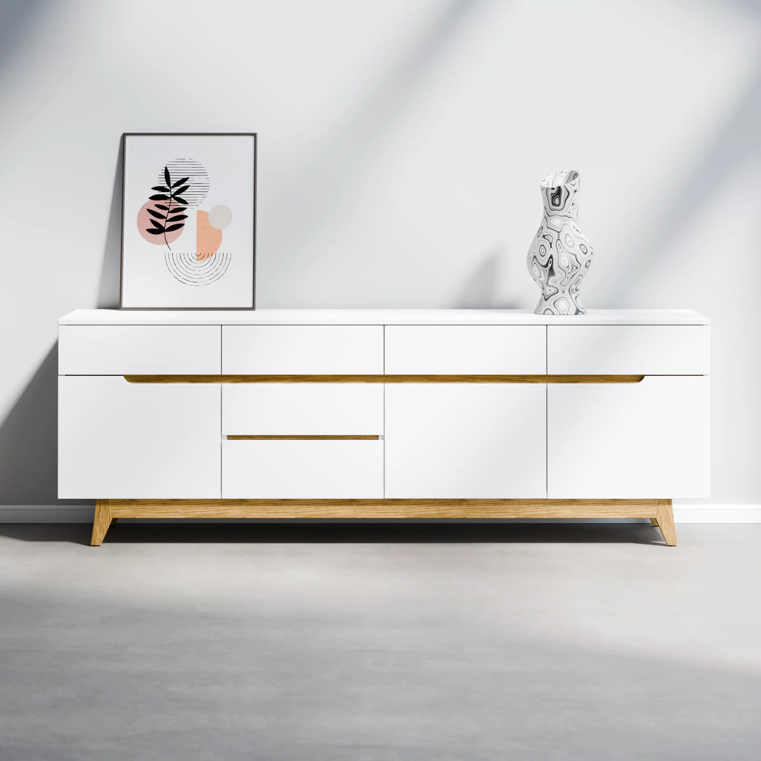 Lyng הוא מזנון עץ לסלון בעיצוב סקנדינבי־מודרני שמאחד בין ניקיון צורני לחום טבעי. פסי עץ אינטגרליים בגוון אלון יוצרים קו אופקי שמוסיף עומק טבעי למראה הנקי של הגימור האפוקסי. ארבע מגירות עליונות, שלוש דלתות ושתי מגירות תחתונות – כולן עם מנגנון טריקה שקטה – מספקות פתרון אחסון פרקטי ומאוזן. רגלי עץ אלון מלא מוסיפות נוכחות חמימה ונקייה.